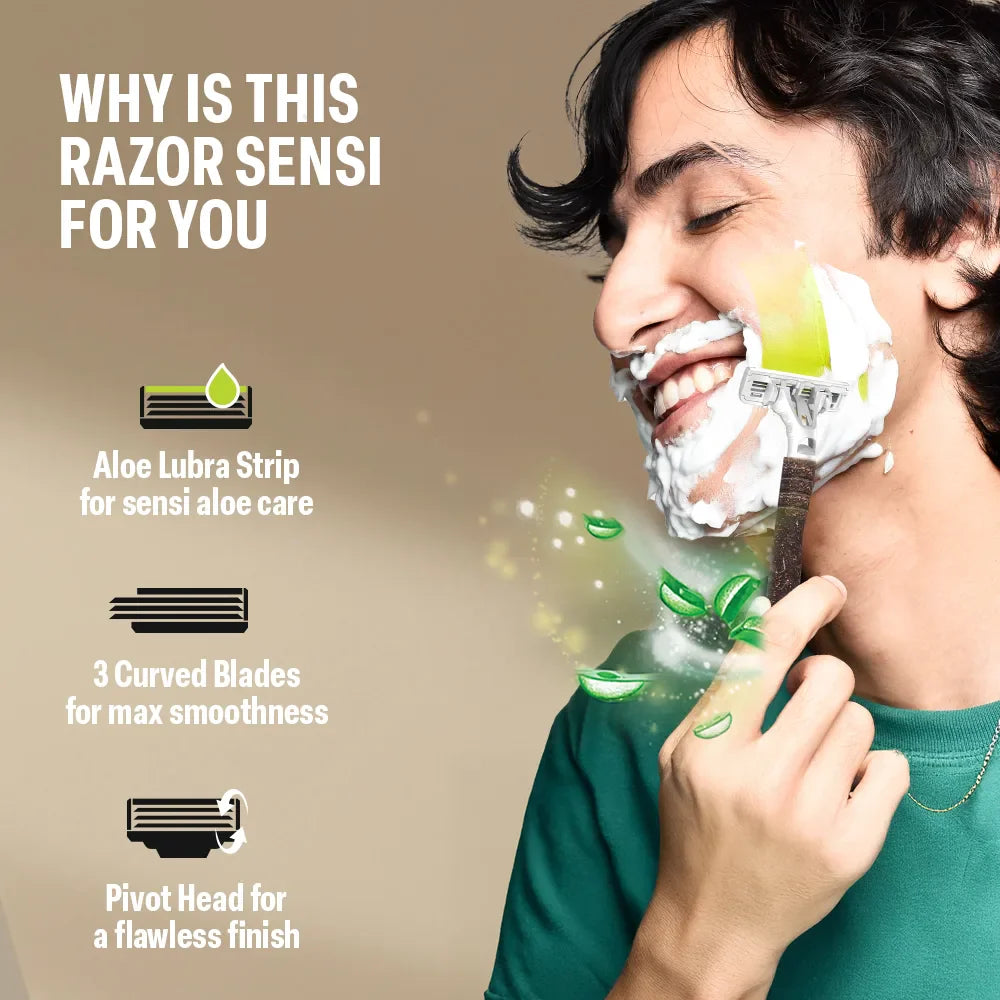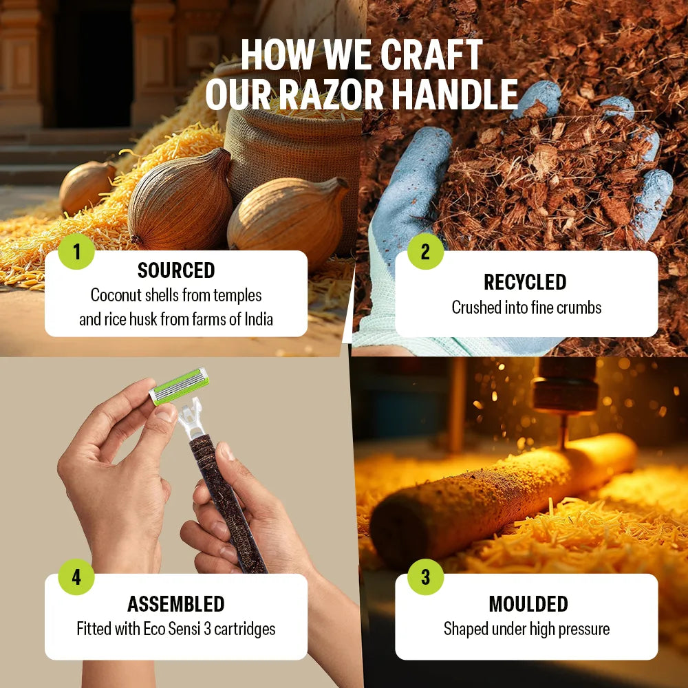 Eco Sensi 3 combines environmental responsibility with exceptional shaving. The handle uses recycled coconut shells and rice husk from Indian temples and farms, creating a durable eco-alternative to plastic. Triple curved blades provide close, comfortable shaves with minimal irritation, while the aloe vera lubrication strip soothes and hydrates skin. Each cartridge delivers up to 15 shaves for cost-effective sustainability, featuring an ergonomic design for comfortable grip and precise control.