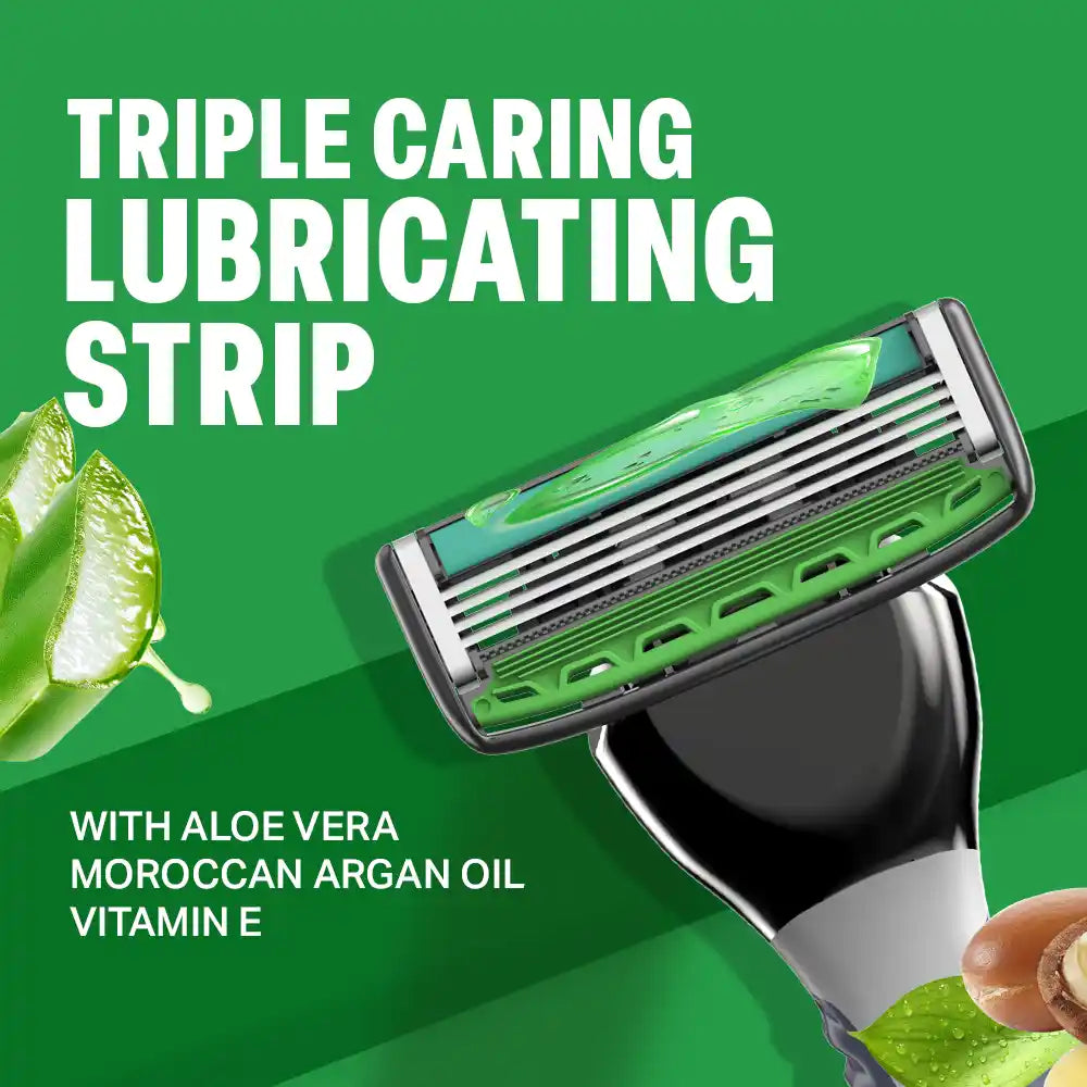 Experience revolutionary 4-blade technology that delivers exceptional smoothness while staying gentle on your skin. The curved, skin-hugging blades and pivot head seamlessly glide over facial contours for an irresistibly close shave. It has a lubricating strip composed of Moroccan Argan Oil, Aloe Vera and Vitamin E that makes each glide extra gentle and moisturising.